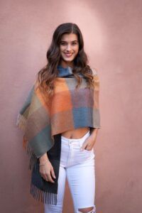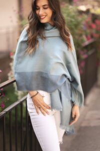 Te presentamos nuestro Chal peruano de Baby Alpaca y Seda multicolor, con predominio del color turquesa, el accesorio perfecto para mantenerte abrigada todo el año.