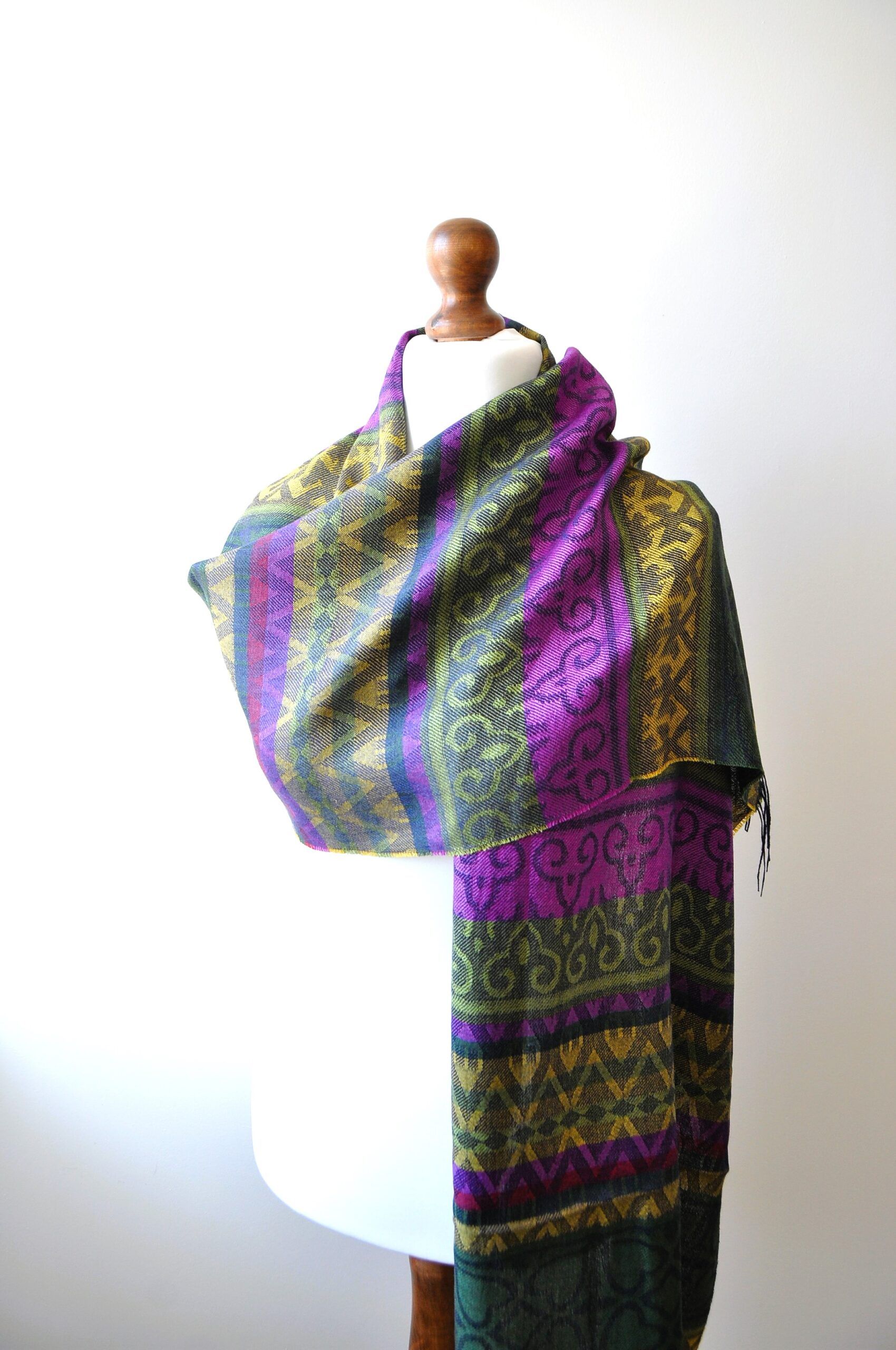Introducing our Multicolored Baby Alpaca and Silk Peruvian Shawl, predominantly dark green with color touches, the perfect accessory to keep you warm all year round.