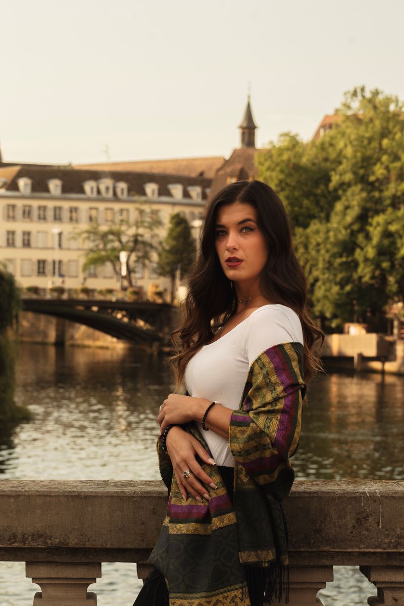 Indulge in a sensation of luxury and softness with our Baby Alpaca and silk Peruvian shawl. With its modern design in shades of dark green with color touches, this handwoven shawl boasts superior natural fibers, including Peruvian baby alpaca wool and silk.